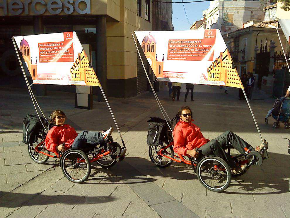 Disponemos de triciclos reclinados únicos, los Pultitrixi, un soporte publicitario excepcional por lo inusual de su diseño. Al circular tumbado en lugar de sentado, el conductor capta de inmediato la atención del público, generando expectación y curiosidad en cualquier entorno. Sobre esta singular base colocamos un cartel publicitario que, gracias al magnetismo del vehículo, logra una visibilidad extraordinaria. Es, sin duda, uno de los soportes más impactantes  de nuestro catálogo.